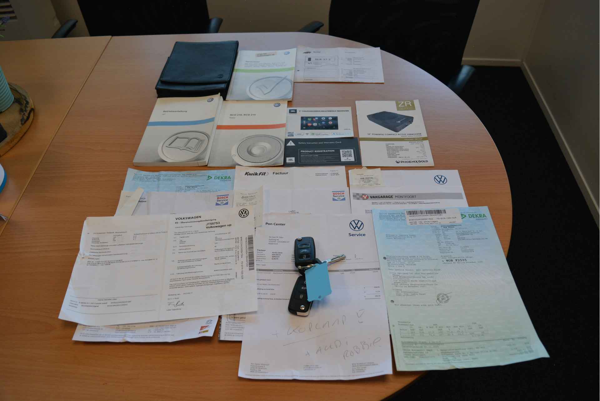 Uiteraard is alle documentatie aanwezig, denk hierbij onder ander aan: Mapje, Onderhoudsgegevens, Facturatie, Volkswagen onderhoudslijsten, Nationale Auto Pas, Instructieboekje, Handleiding auto en Sub, etc.